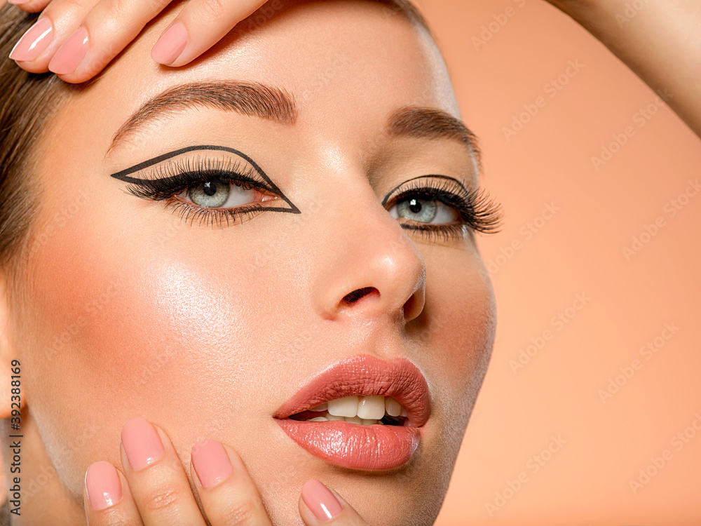 Beautiful girl with makeup in the form of arrows. Face of a young girl close-up with fashionable makeup. Stylish makeup.