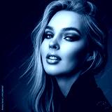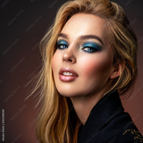 Portrait of sexy blonde woman with a beautiful face. Fashion model with long hair, studio shot. Photo of young stylish woman in black clothes with blue make-up.