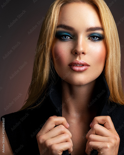 Photo of young stylish woman in black clothes with blue make-up. Portrait of sexy blonde woman with a beautiful face. Fashion model with long hair, studio shot.