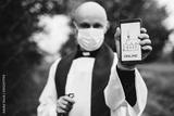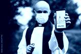 Priest in a medical mask and protective gloves holds a mobile phone with information about online meetings.