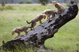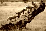 The cheetah (Acinonyx jubatus), also known as the hunting leopard, cubs on a slant dry tree. Cheetah cubs playing in the savannah with dry charred trees.
