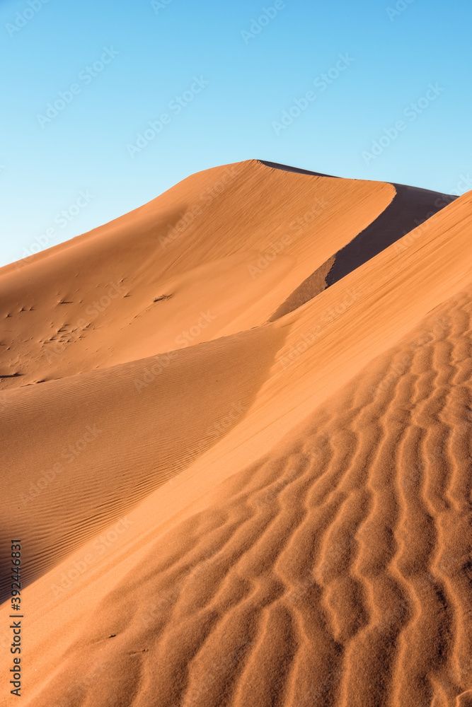 Daytime close-up desert dunes of Erg Chigaga, at the gates of the Sahara. Morocco. Concept of travel and adventure.