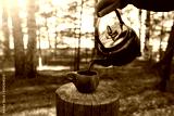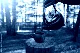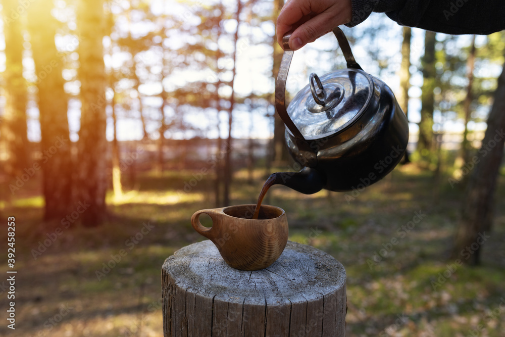 Coffee in the summer forest. Hand pours into a cup of coffee. Camping, hiking concept.