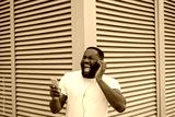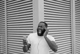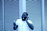 Emotional African American man listening to music outdoors, singing song. Happy hipster guy wearing casual clothing dancing on urban street, having fun