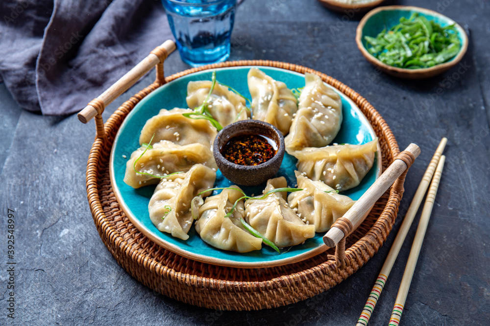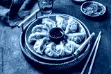 Asian Potstickers dumplings Gyoza with Soy Sauce