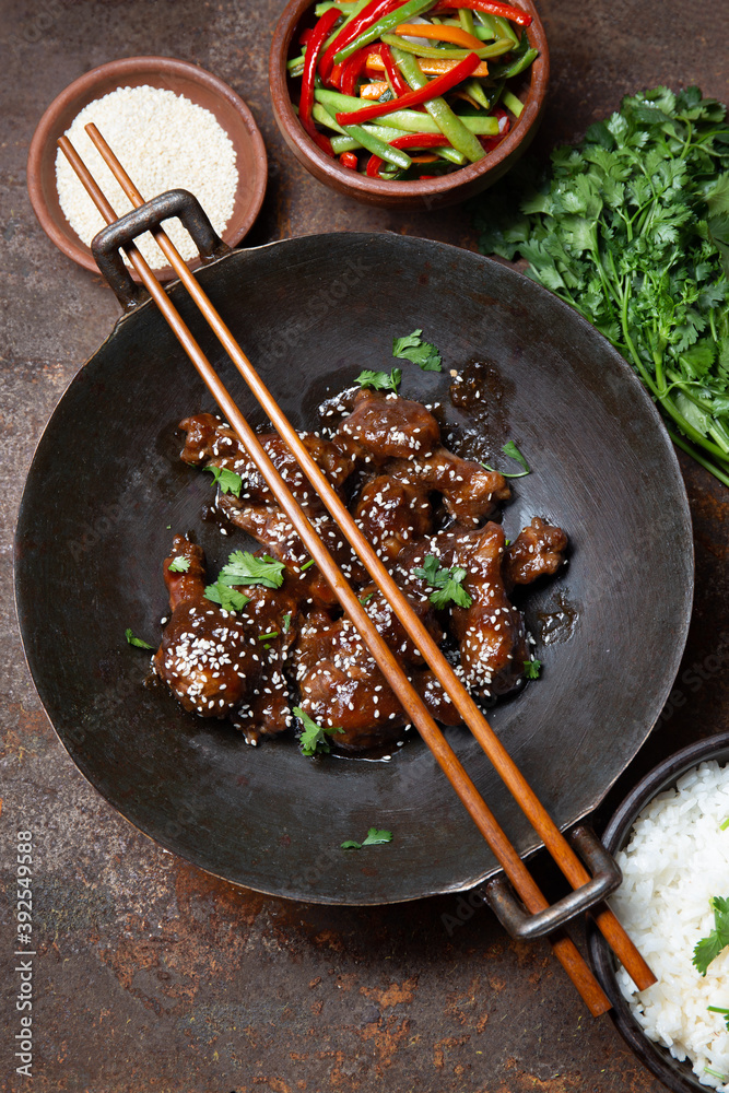 Chicken teriyaki with rice and vegetables on brown background.