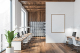 White and wooden office room with mockup blank canvas with computers on tables and white armchairs. Open space business room with bookshelves, wooden wall and floor, 3D rendering no people