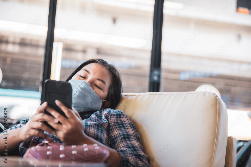 Asian woman in medical face mask sitting on sofa using smartphone in cafe