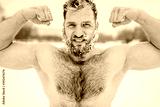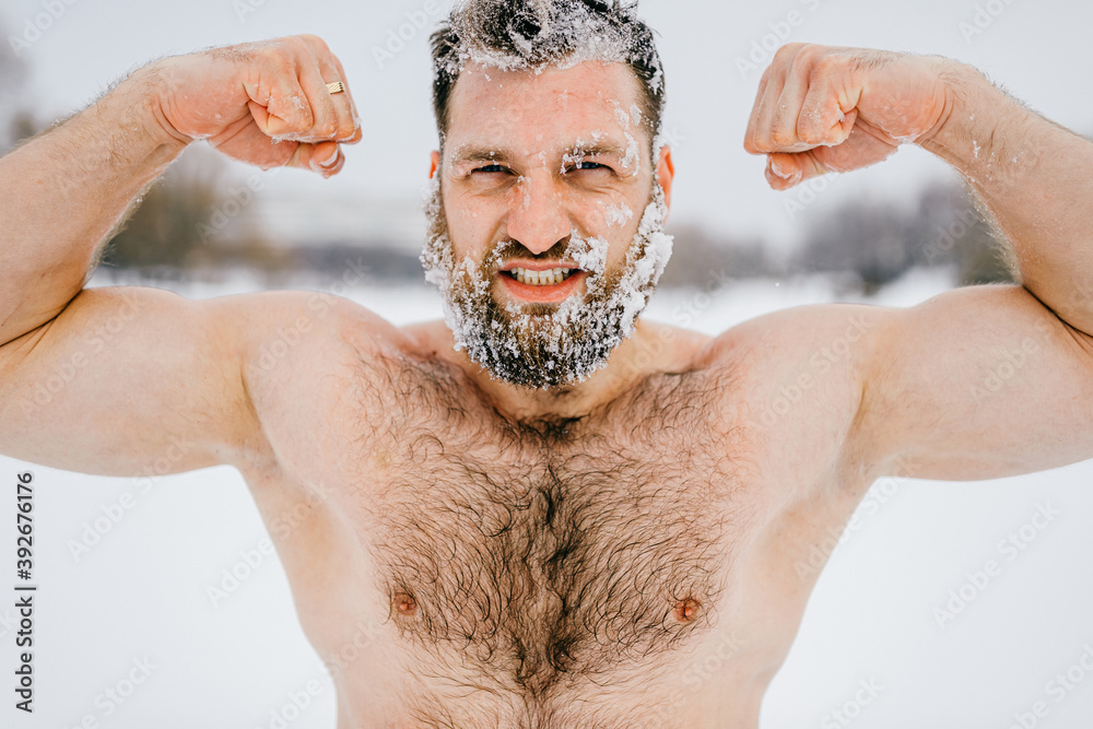 Strong brutal naked man with frozen beard showing muscules outdoors