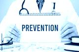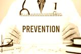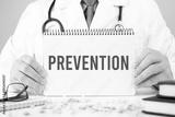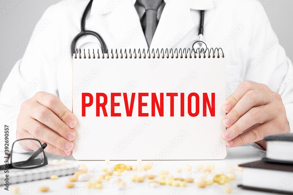 Doctor in a dressing gown holds a notepad with text PREVENTION, Medical concept