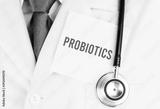 White sticker with text Probiotics lying on medical robe with a stethoscope