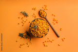 Fresh ripe sea buckthorn on orange background, flat lay