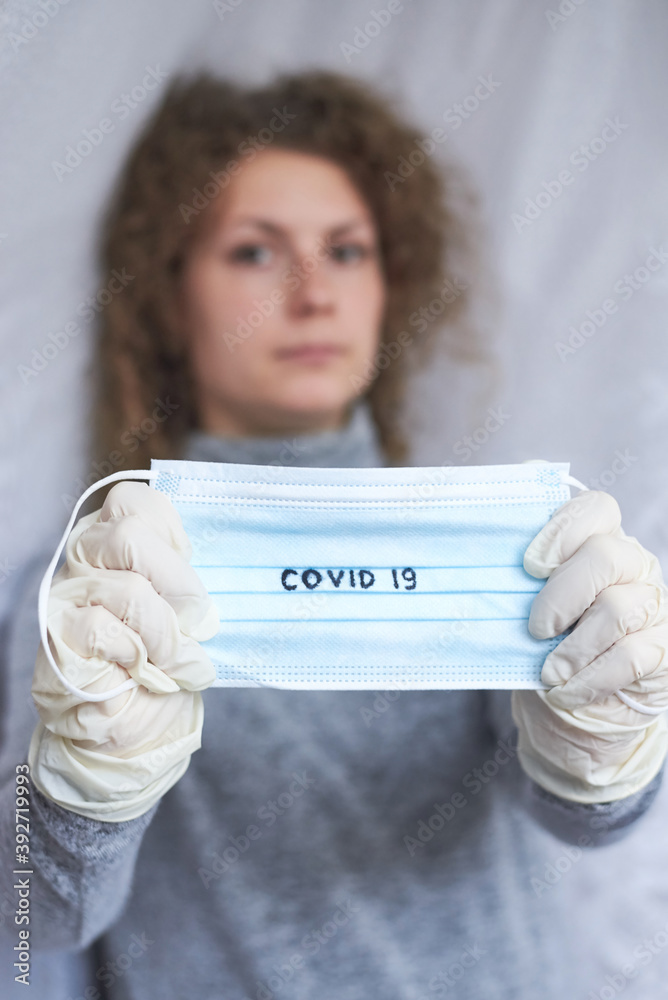 A woman's hands in medical gloves hold a mask with the inscription Covid 19.