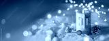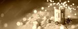 Christmas Candle on white linen with golden lights - Natural decoration with pine cones and twig - Merry Christmas Card - Advent Banner, Panorama, Background
