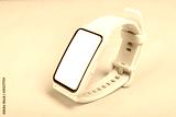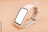 Mockup image Fitness watch on pastel background. Close-up. Front view of pink smartwatch with blank white touch screen display. pink color