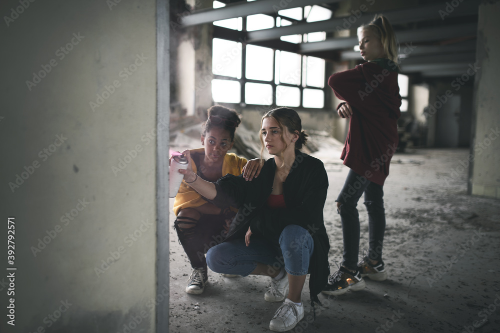 Group of teenagers girl gang indoors in abandoned building, using spray paint on wall.