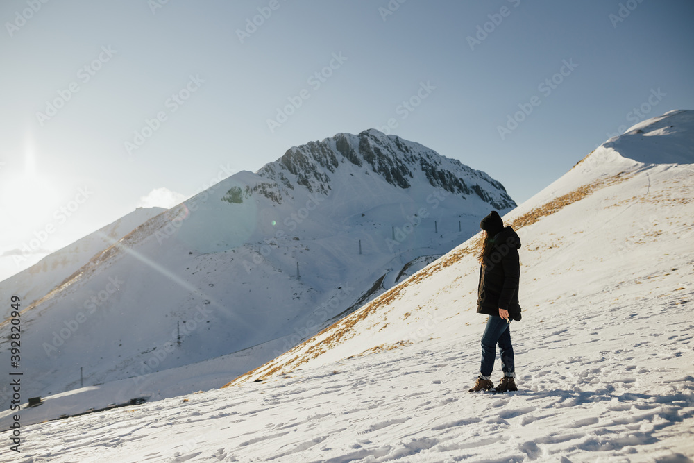 Girl looking at a snowy mountain landscape in a sunny winter day.