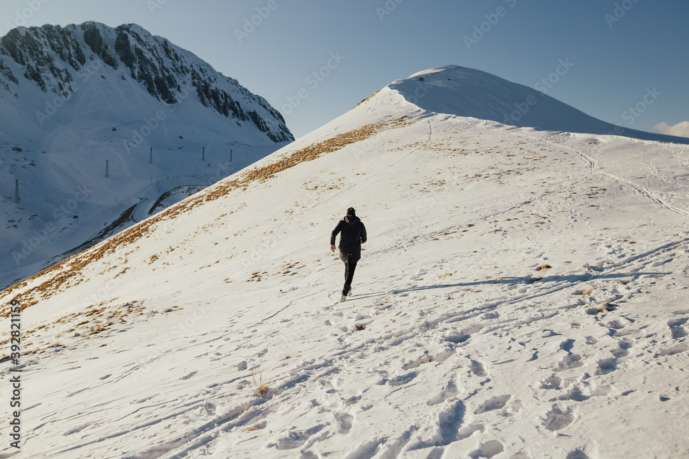 Back view of man running and having fun on winter mountain with beautiful landscape.