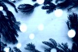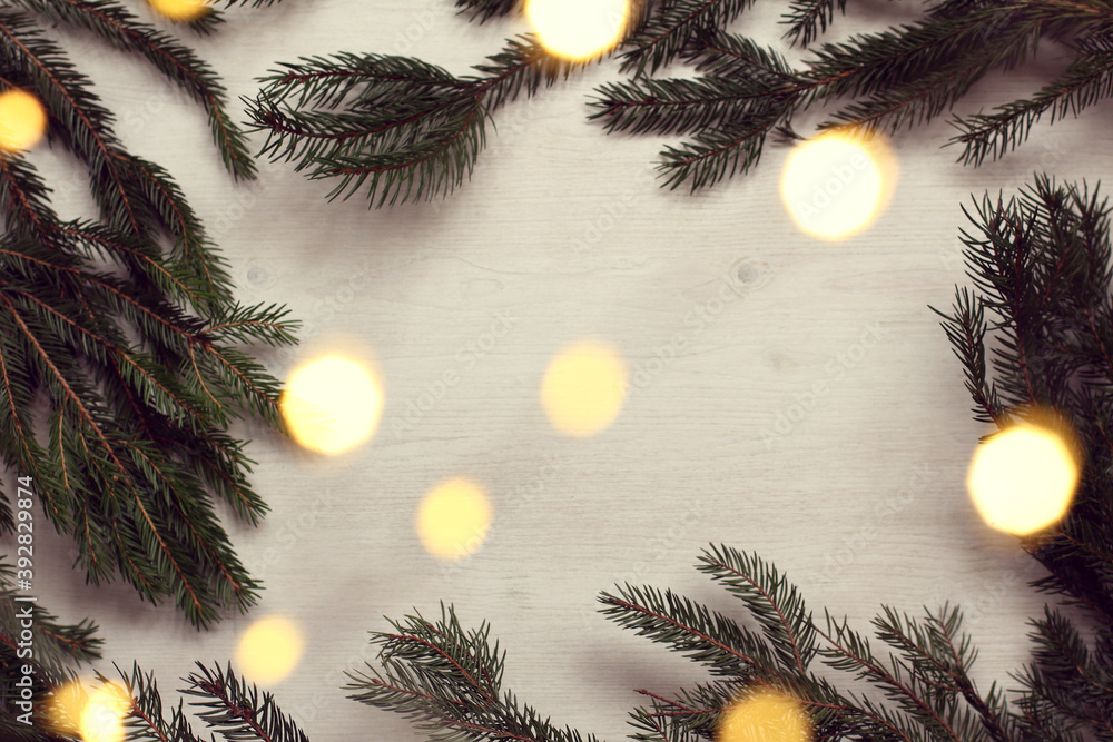 branches of a Christmas tree with garland lights on the table top view. festive retro frame
