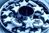 Variety of christmas cookies served in a round baking pan