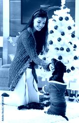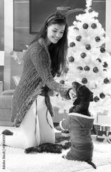 Young woman playing with dog at christmas time, smiling, wearing reindeer antler.