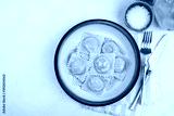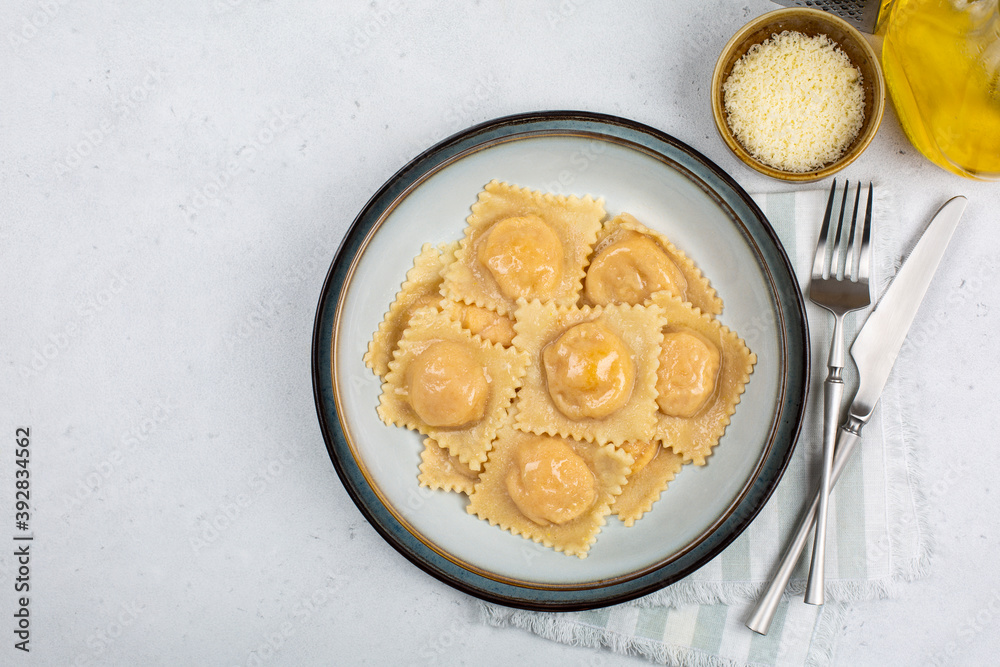 Italian dinner: tortelli stuffed with pumpkin and parmesan cheese. White background. Copy space.