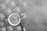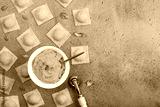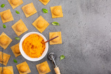 Raw tortelli with pumpkin filling. Pumpkin filling made from baked pumpkin, egg, bread crumbles, nutmeg. Traditional italian recipe.