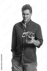 Casual older white man man holding green salad - healthy eating. Disappointed and misgiving.
