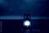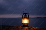 Beautiful old rustic oil lamp silhouette on the rock in a beautiful sea backgroud. Night time. Light in the dark and hope concept.
