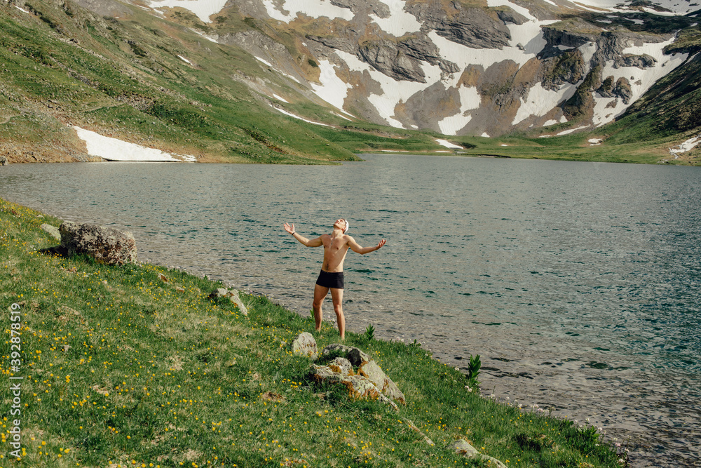 Happy young male tourist in a bathing suit