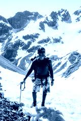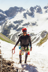 Man climber mountaineering with ice axe in mountains