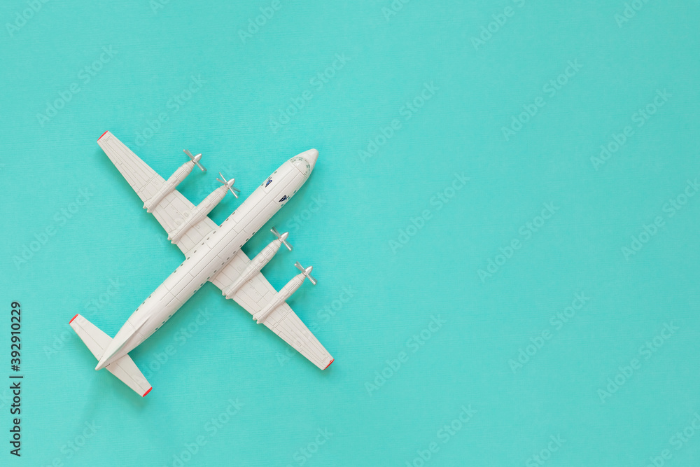 a toy plane on a bright colored background, the concept of resuming flights around the world after the coronavirus, restoring the finances of airlines and tour operators.