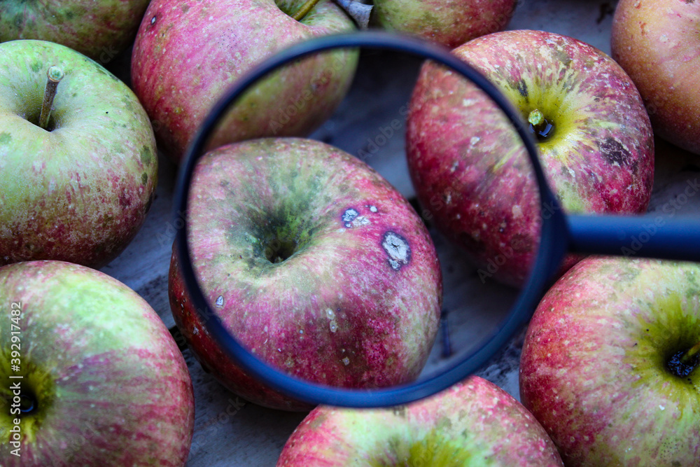 Apple magnified with a magnifying glass of bitter spot or bitter pit. Bitter pit is a disorder in apple fruits, now believed to be induced by calcium deficiency.