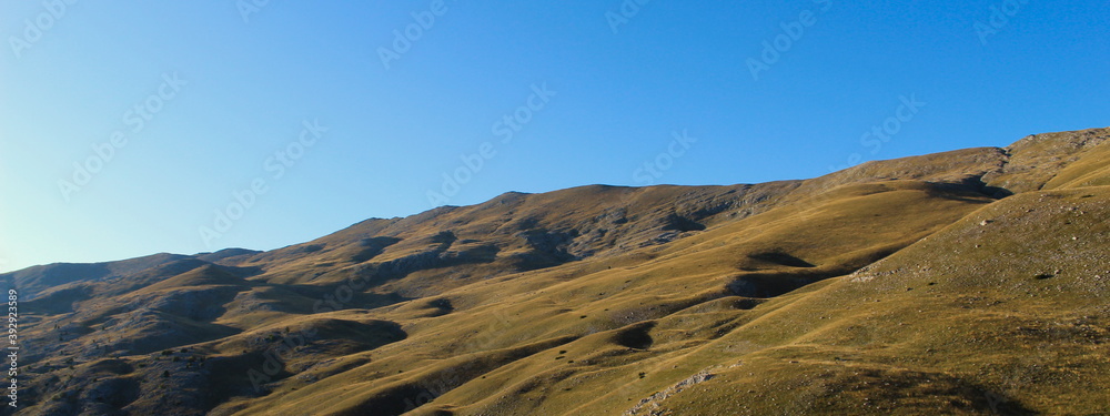Banner. Mountain in the fall before sunset. Landscape of Bjelasnica mountain, meadows, pastures, grass, stones, sky. Simple but magnificent landscape view.