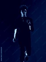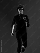 one youg caucasian runner jogger running jogging man in studio shadow silhouette isolated on white background