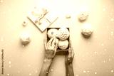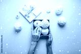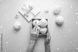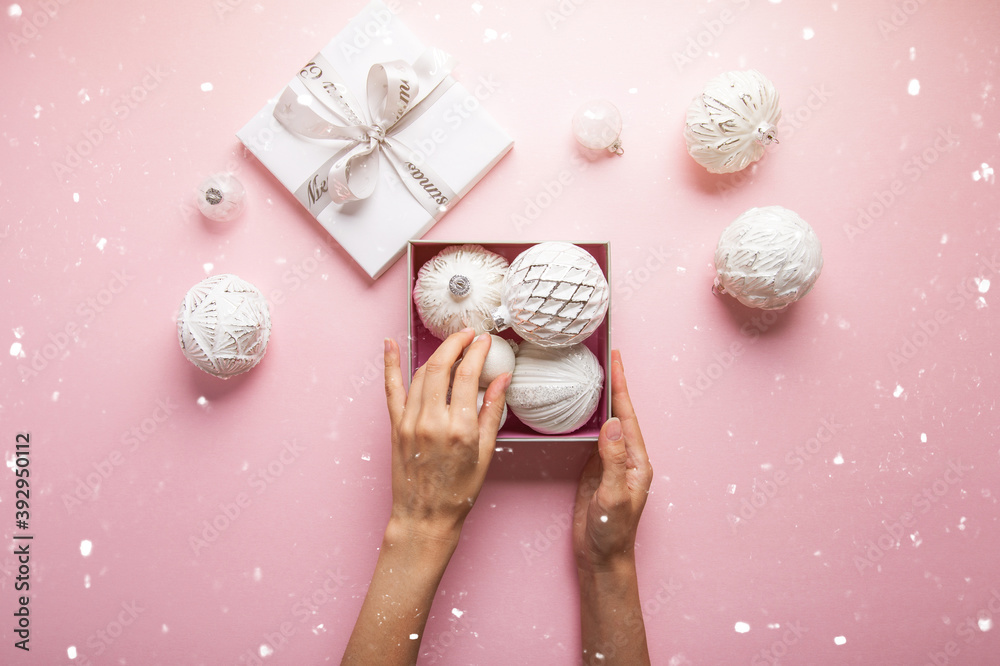 Merry Christmas and Happy Holidays greeting card, frame, banner. New Year. Noel. Christmas white silver ornaments on pink background top view. Winter xmas holiday theme. Flat lay
