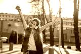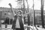 A girl of 10 years with her hands up and headphones over her ears