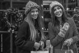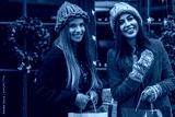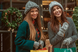 Christmas, New Year, winter holidays, shopping conception: two happy smiling women, friends, sisters, wearing knitted hat, coats, posing in street with festive decorations. Copy, empty space for text