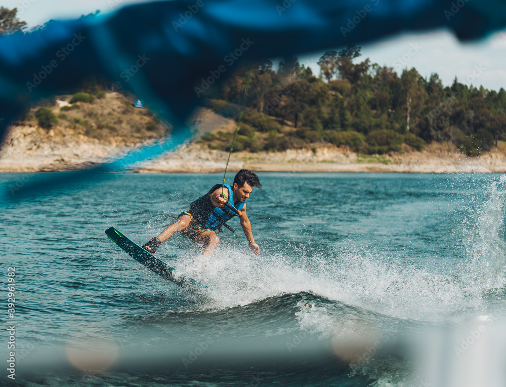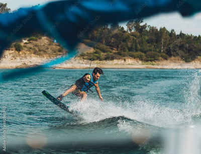 young man doing wakeboarding in a lake whit mountains also doing jumps