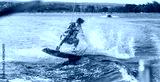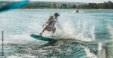 young man doing wakeboarding in a lake whit mountains also doing jumps
