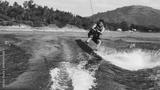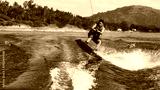 young man doing wakeboarding in a lake whit mountains also doing jumps