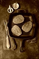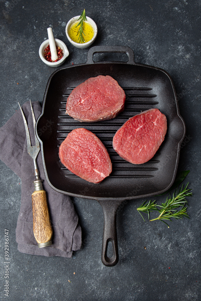 Raw beef steaks on cast iron grill pan. Top view, black background