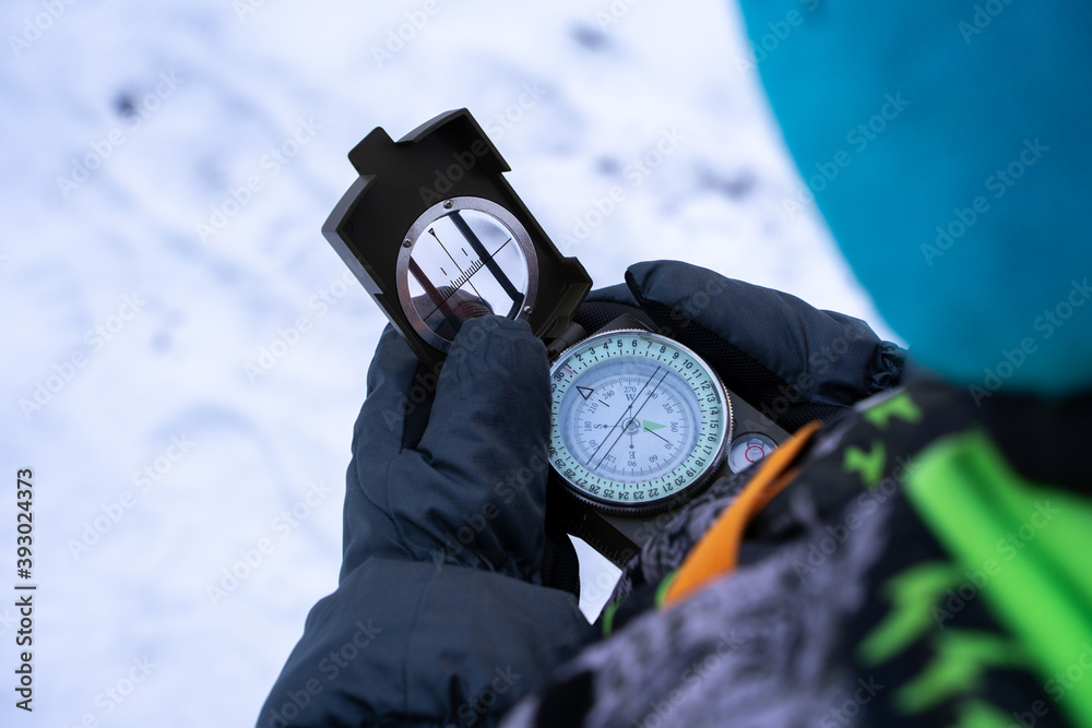 A boy in mittens in the winter forest holds a compass in his hands. Boy trying to navigate in the forest using a compass