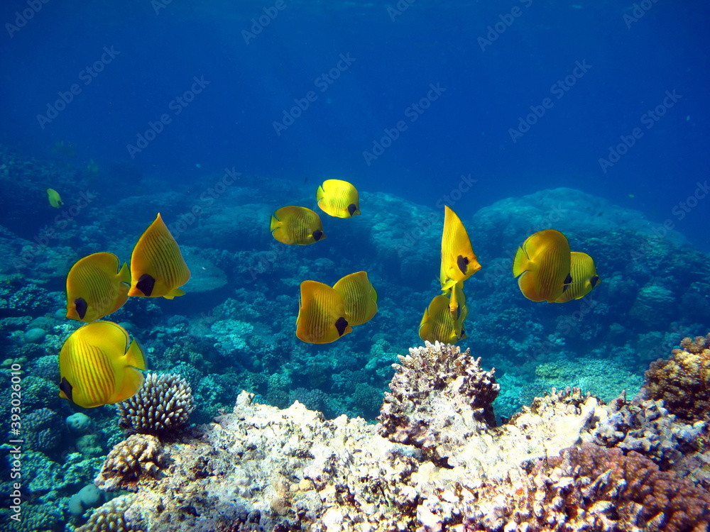 Butterfly fish Chaetodontidae. Masked Butterfly Fish - This butterfly fish grows up to 23 cm, is more common in pairs and sometimes in small schools.
