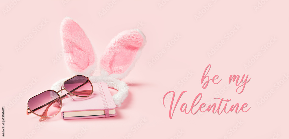 Be my Valentine card with pink bunny ears and heart shaped pink sunglasses. Sexy fantasies fancy dress. St Valentines and love concept