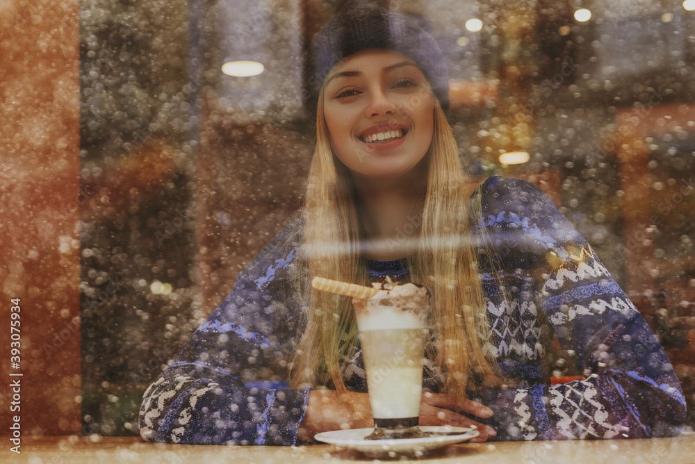 Christmas, winter holidays conception: happy smiling woman drinks hot drink in cafe. View through the window glass. Snowfall. Copy, empty space for text