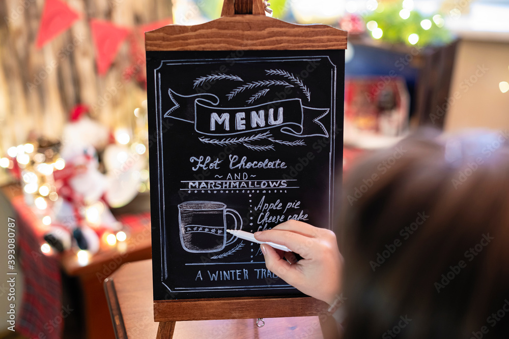 Woman drawing christmas menu of cocoa bar on small chalkboard.