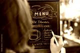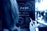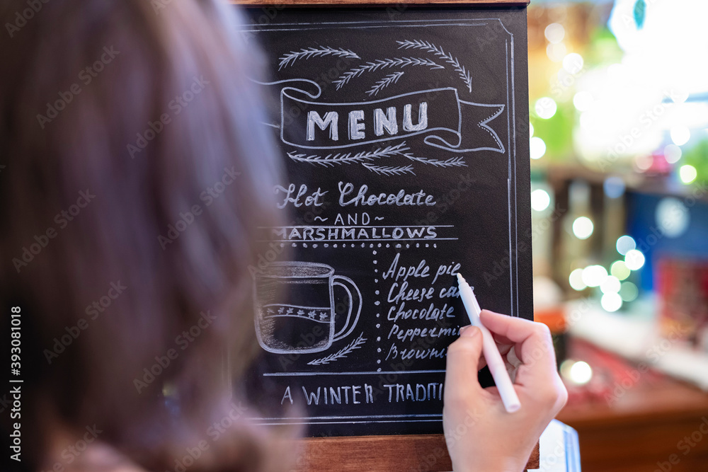 Woman drawing christmas menu of cocoa bar on small chalkboard.