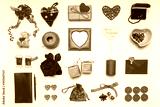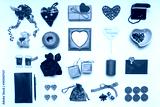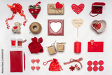 Stylish accessories, decorative items and miniature toys in red color on white background. Empty photoframe, mock up. Greeting card for Valentine's day, love and romance concept. Copy space