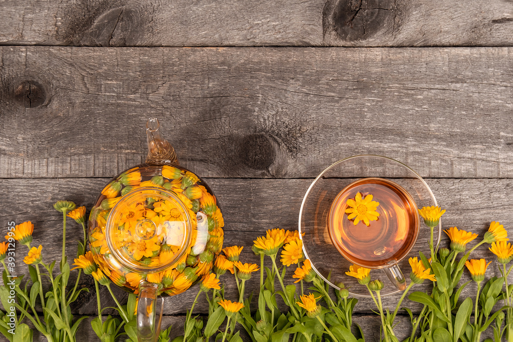 Cup of herbal tea and transparent teapot and marigold flowers on wood background. Calendula Tea Benefits Your Health concept. Top view Copy space